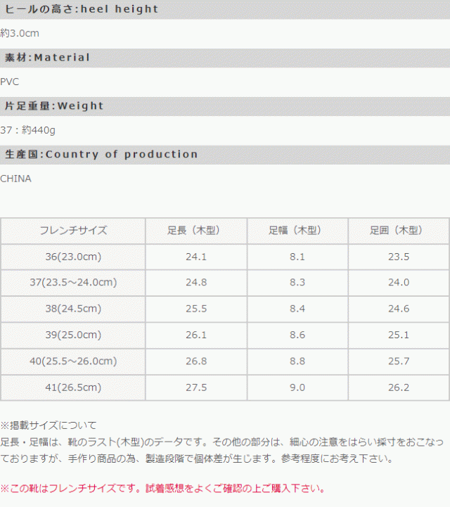 ・PVC素材の性質上、高温により靴が変形する恐れがあります。直射日光の当たる日向や、温度上昇の可能性のある倉庫・車内等での保管はご遠慮ください。・生産時期により、色合い、風合い、質感に差が生じる場合があります。