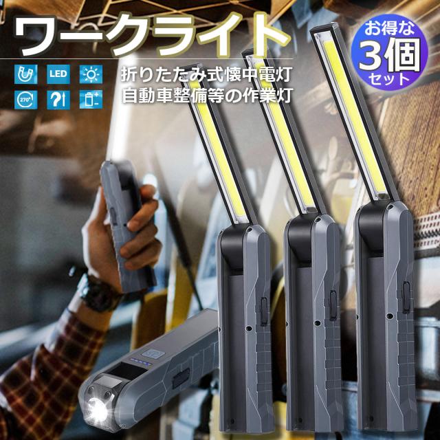 懐中電灯 充電式作業灯 LEDワークライト 3個セット USB充電式 LED検査ライト ハンディライト 折り畳み式 マグネット機能搭載 COB LED作業灯 電池残量表示 フック付き 夜間作業 自動車修理 防災 キャンプ 読書