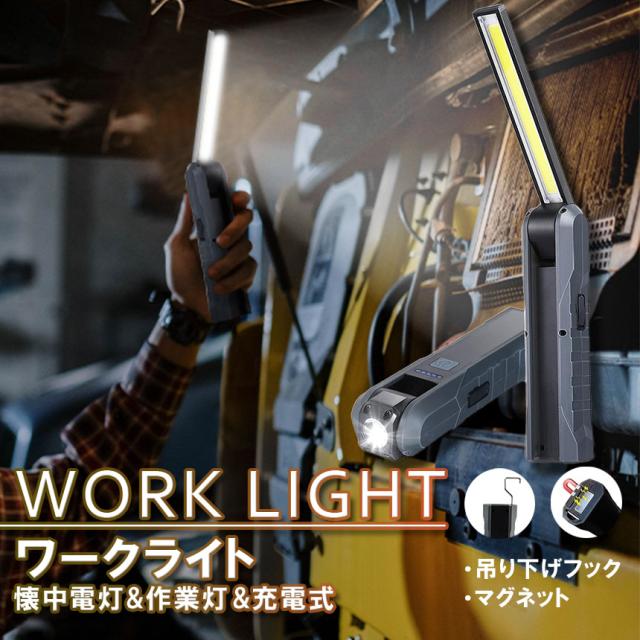懐中電灯 充電式作業灯 LEDワークライト USB充電式 LED検査ライト ハンディライト 折り畳み式 マグネット機能搭載 COB LED作業灯 電池残量表示 フック付き 夜間作業 自動車修理 防災 キャンプ 読書