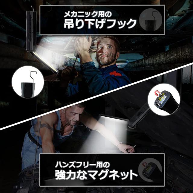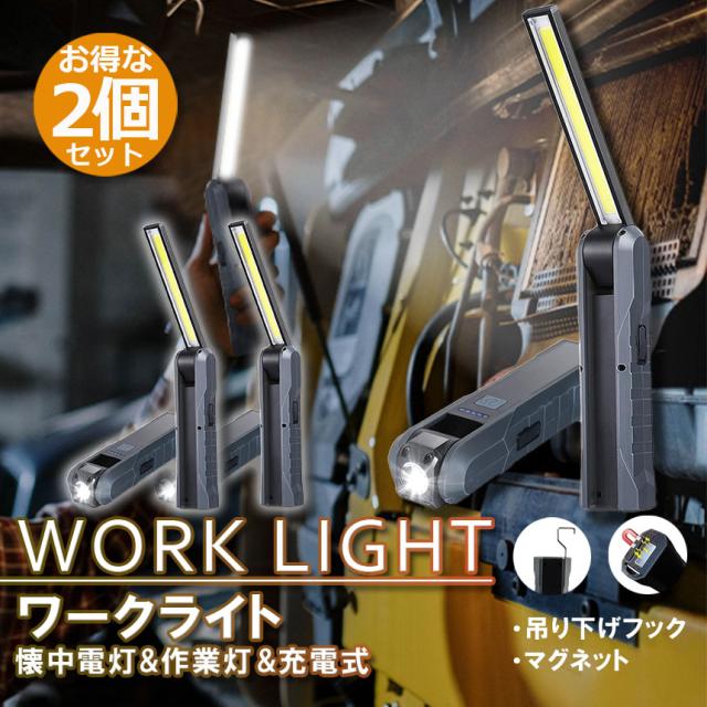 懐中電灯 充電式作業灯 LEDワークライト 2個セット USB充電式 LED検査ライト ハンディライト 折り畳み式 マグネット機能搭載 COB LED作業灯 電池残量表示 フック付き 夜間作業 自動車修理 防災 キャンプ 読書
