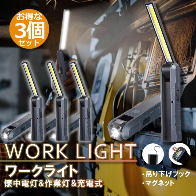 懐中電灯 充電式作業灯 LEDワークライト 3個セット USB充電式 LED検査ライト ハンディライト 折り畳み式 マグネット機能搭載 COB LED作業灯 電池残量表示 フック付き 夜間作業 自動車修理 防災 キャンプ 読書