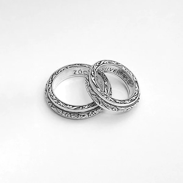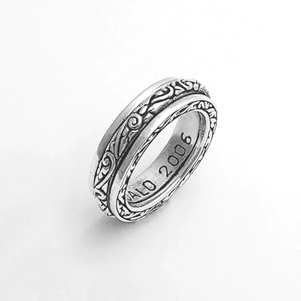 『力強い生命力』『永遠』が意味合いの蔦(アイビー)が彫り込まれたリングが回る指輪。