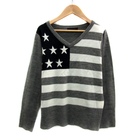【中古】ジーナシス ニット カットソー 長袖 Vネック 星柄 ボーダー柄 ウール混 マルチカラー グレー レディース