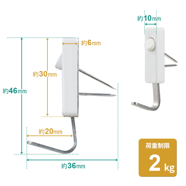 石こうボードに2本のピンでしっかり取り付けができる、強力なピンフックの【2個セット】。