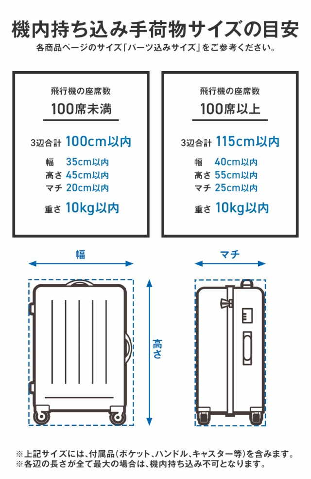・機内持ち込み可能サイズは航空会社や飛行機の機種などによって異なります。詳細につきましては、各航空会社へ直接お問い合わせください。