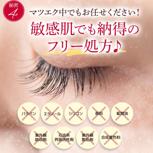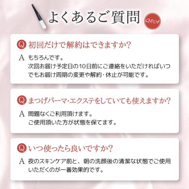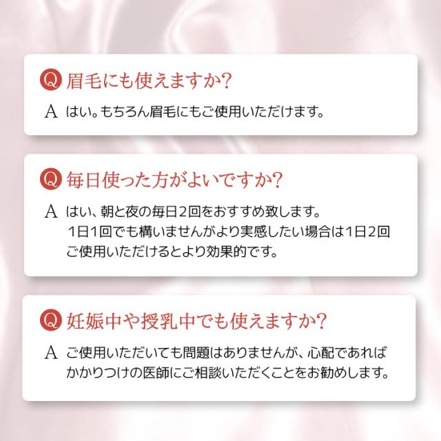 | 使用方法 | (1)朝晩、洗顔後の清潔な目元にご使用ください。上下のまつ毛の生え際と全体にやさしくつけてください。 (2)眉毛にもご使用いただけます。眉毛へ塗布した後、指の腹で全体へ優しく馴染ませてください。 (3)※まつ毛エクステを付けたままでもご使用いただけます。 |
