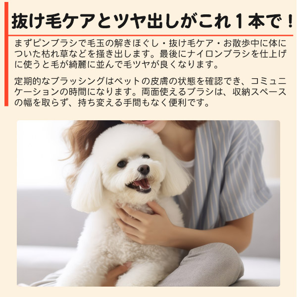 ペット用ブラシ 1台2役 ピンブラシ ナイロンブラシ ムダ毛 抜け毛 アンダーコート お手入れ 毛並み ツヤ出し ペット用 ブラシ ペット用品 トリミング 猫 犬 小動物 ブラッシング 毛玉飲み込み予防 対策 グルーミング トリミング 換毛期 ケアグッズ ペットグッズ