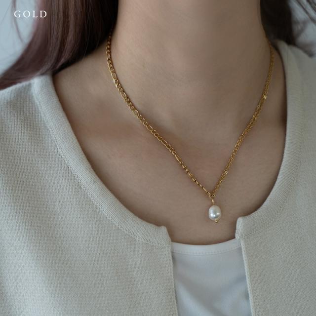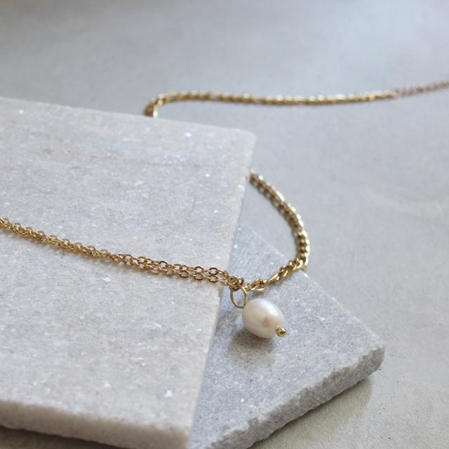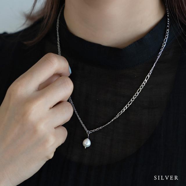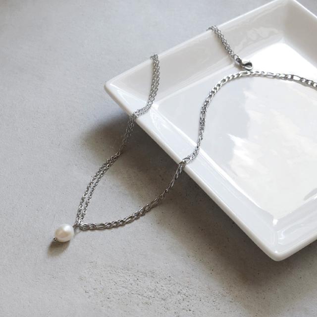 片側にフィガロチェーン、反対側にはあずきチェーンを2本合わせ、立体感のあるシルエットが胸元に映えます。
