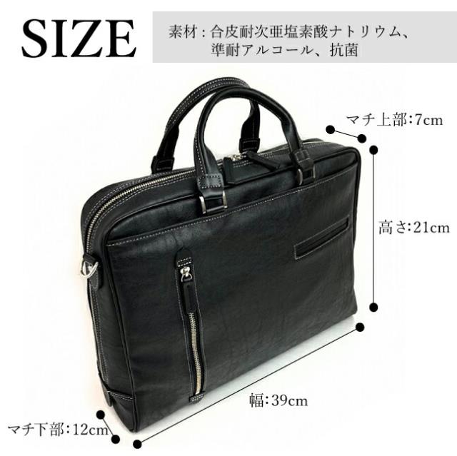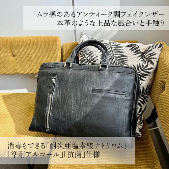 | ・鞄の街、兵庫県豊岡市の鞄職人が仕上げたビジネスバッグです。 ・ムラ感のあるアンティーク調フェイクレザー、本革のような上品な風合いと手触りです。 消毒もできる「耐次亜塩素酸ナトリウム」「準耐アルコール」「抗菌」仕様です。 ・メインルームはA4ファイル収納、PC収納ポケット、両サイドにペットボトルなどを入れられるサブポケットが付いています。 | |||