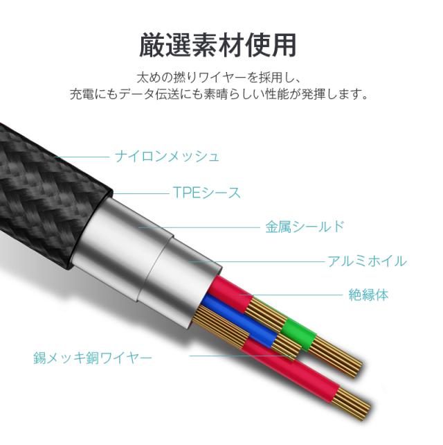 1.高耐久性:高密度配線により、耐久性が高められているのもポイント。外被にはナイロンメッシュを使用しているため、キズやねじれにも強い設計です。