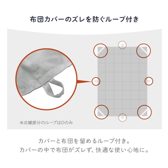 より快適な睡眠のため【キルティング加工:中わたの片寄りを防ぐ】と【カバーと布団を留めるループ付き:布団カバーのズレを防ぐ】仕様なのも嬉しい!