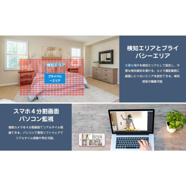 ・24時間常時録画、動体検知時のみの録画機能が付いて、必要に応じて設定可能です。録画したくない時に、アプリ経由でレンズを物理的に閉じることができます。撮影範囲にて録画したくない場所をプライバシーエリアとして設定可能となります。
