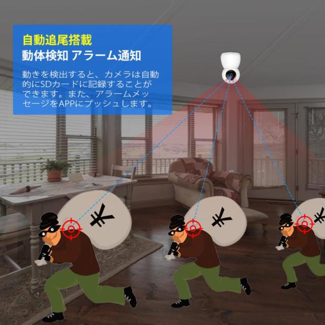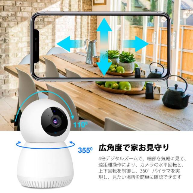 ・本電源コード式ワイヤレス防犯カメラのレンズ画角は110°、且つ左右0-355°、上下0-58°に楽に回転でき、PTZ機能によって、全方位監視できます。