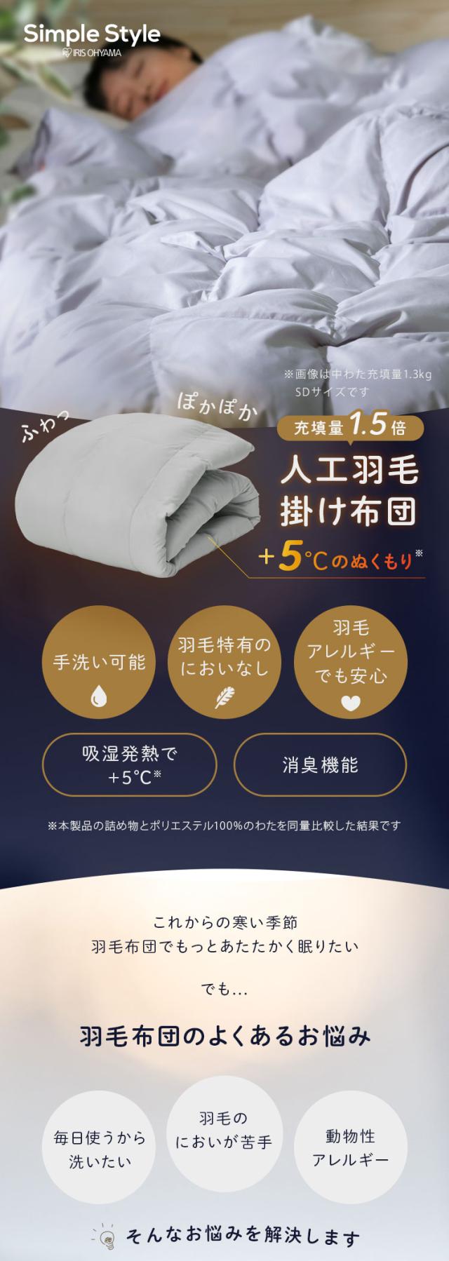 あたたかい眠りをサポートする、人工羽毛を使用した掛け布団“ダブルサイズ(約190×210cm)”の中わた増量タイプ。