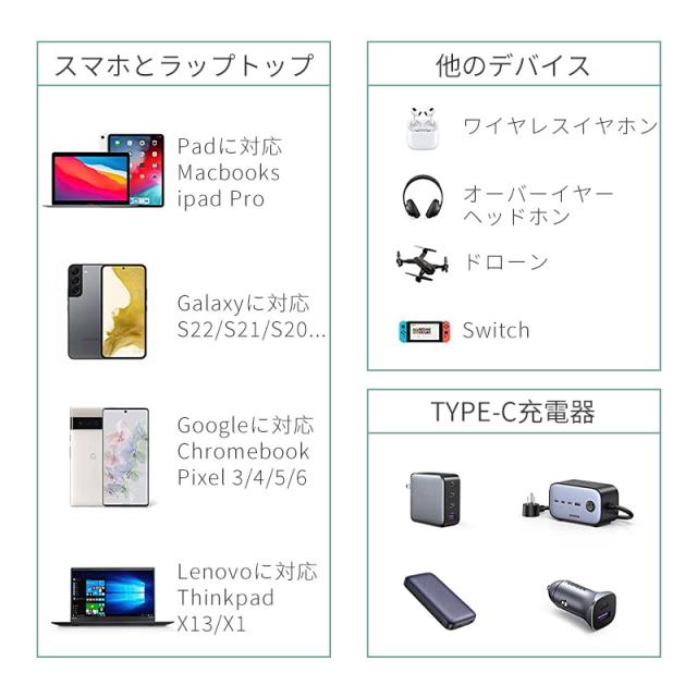 ・対応機種:USB Type-C端子を持つパソコン・充電器・モバイルバッテリーおよび、USB Type-C端子を持つスマートフォン・タブレットなど。