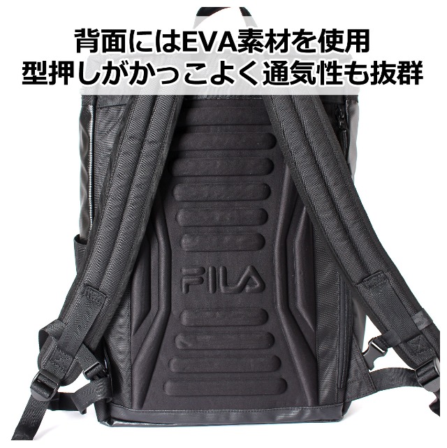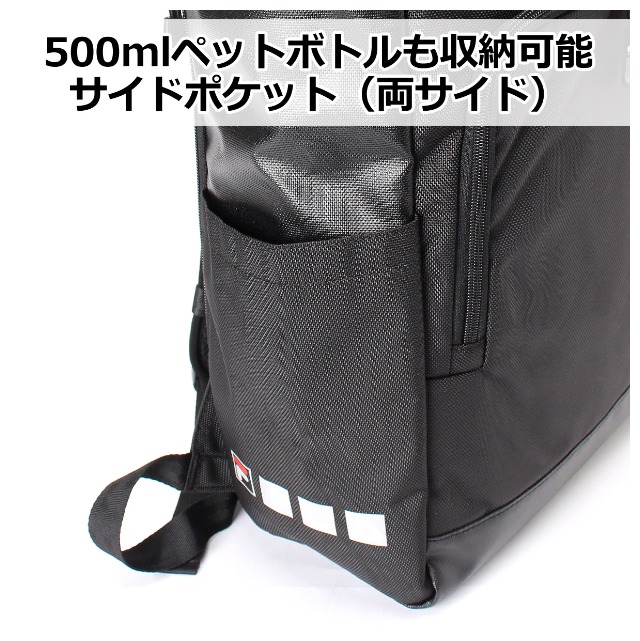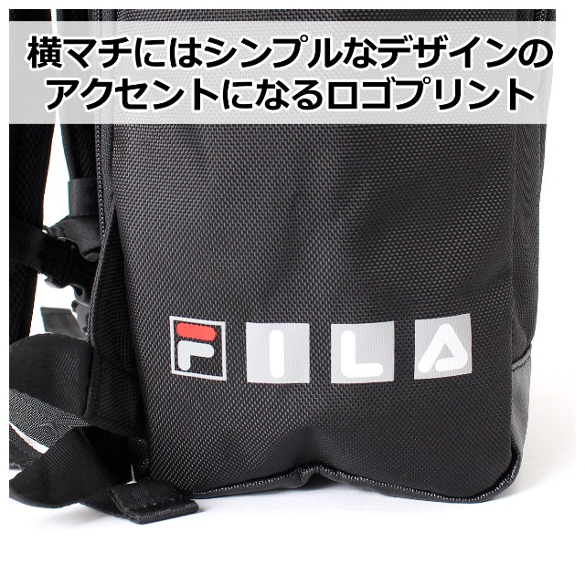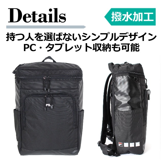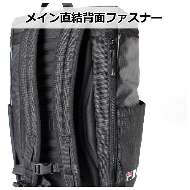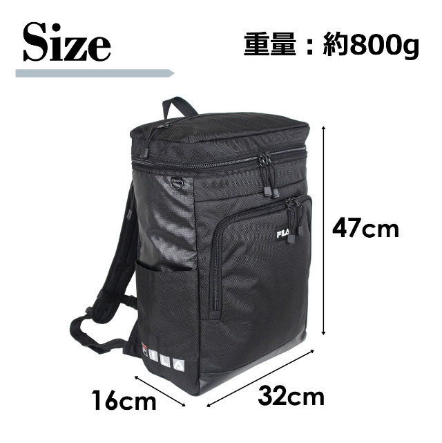 | 【fl-0007】FILA STREET スクエアリュック 素 材|ポリエステル(1680D) サイズ |約 横32×縦47×マチ16cm 重 量|約 800g 仕 様|[外側] ・フロントファスナーポケット×1 (内側にメッシュポケット付き) ・上部ファスナーポケット×1 ・両サイドにオープンポケット ・メイン直結背面ファスナー ・チェストベルト付き ・ショルダーベルト長さ調節可能 [内側] ・ウレタンポケット×1 イメージ|かっこいい シンプル クール ブランド FILA フィラ スクエア型 BOX型 撥水加工 黒 クロ ブラック 大容量 軽量 |
