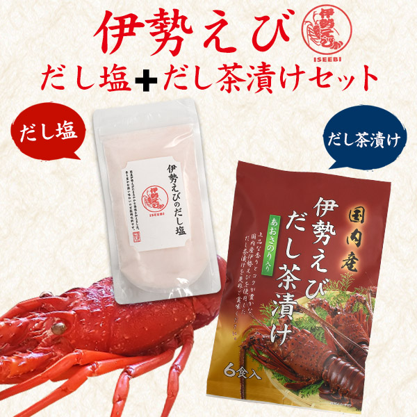 国産の「伊勢えび」にまろやかな海塩を加えたはぎの食品「伊勢えび だし塩」と「伊勢えびだし茶漬け」の2点セット。
