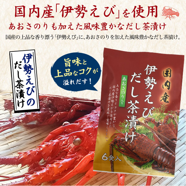 伊勢えびだしの素顆粒(食塩、砂糖、酵母エキスパウダー、伊勢えびまるごとパウダー、その他)(国内製造)、塩茶顆粒(食塩、乳糖、でん粉、抹茶粉末、こんぶ粉末)、ふりかけの素(いりごま、食塩、焼のり、ぶどう糖、鰹節粉末、砂糖、でん粉、その他)、あられ(もち米、うるち米)、ヒトエグサ/調味料(アミノ酸等)、着色料(紅麹色素、紅花黄、クチナシ)、甘味料(ステビア)