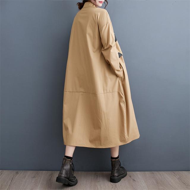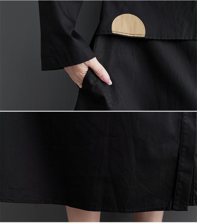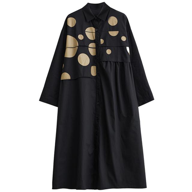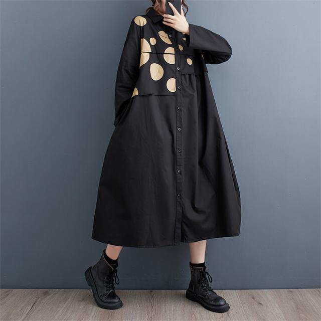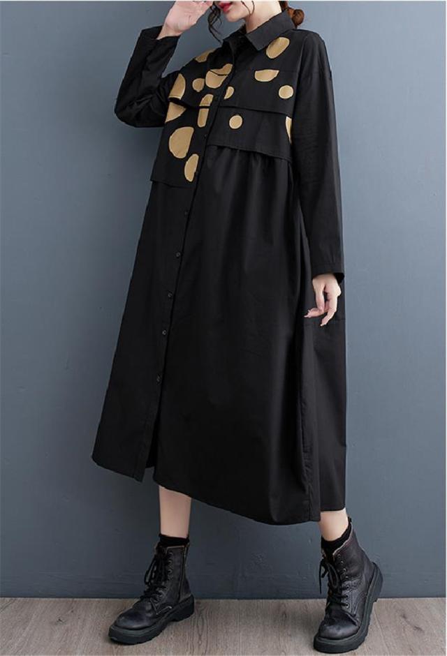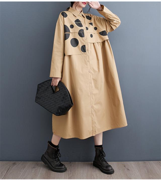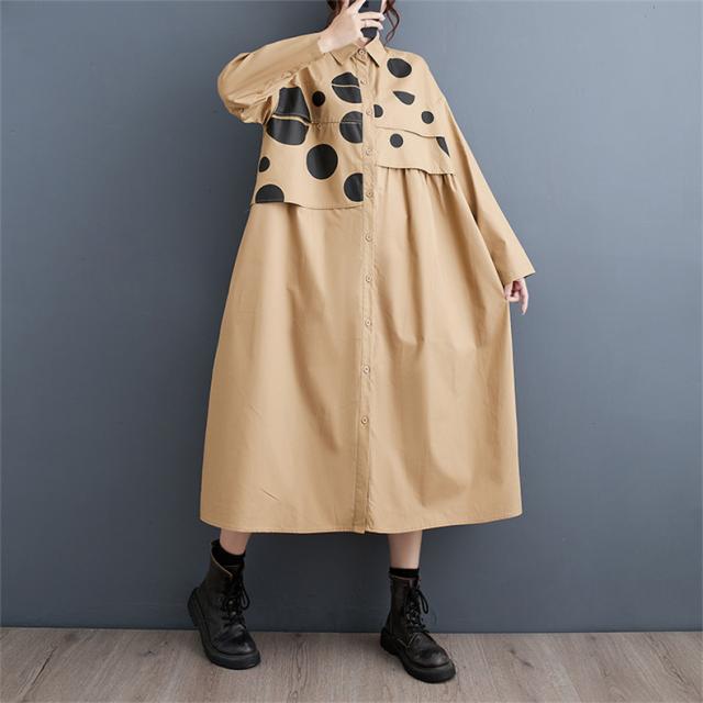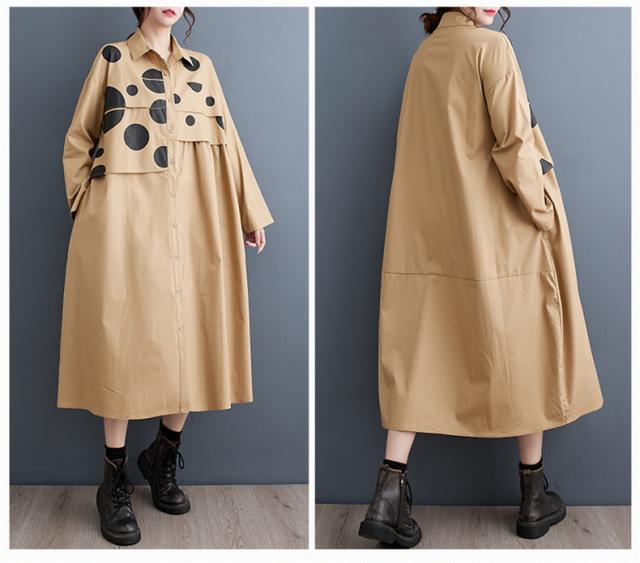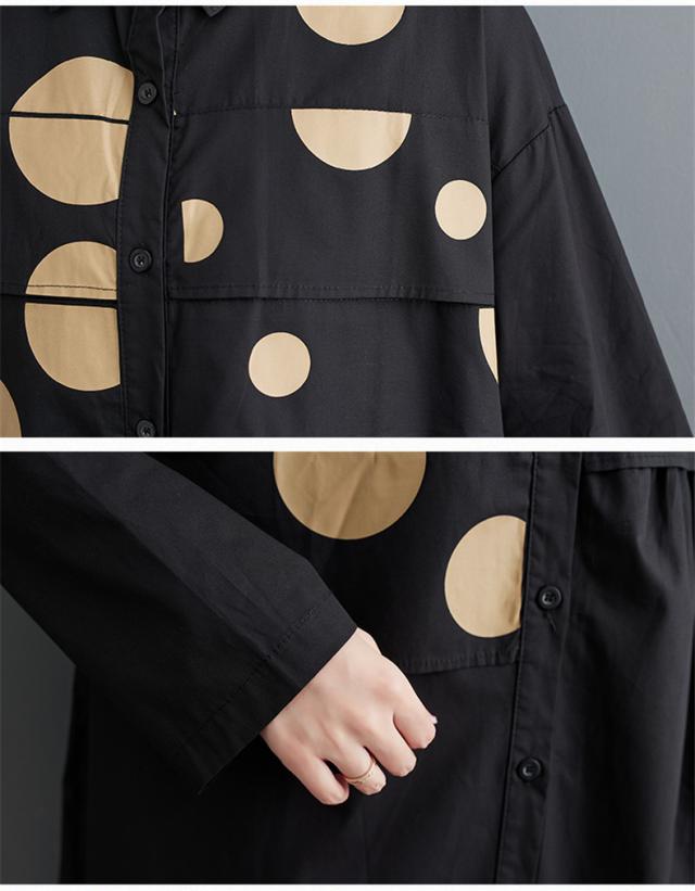 ワンピース シャツワンピース ユッタリ レディース ドット柄 長袖 体型カバー ギャザー入り 秋新作 大きいサイズ 甘くなり過ぎず 切替でスタイルアップ