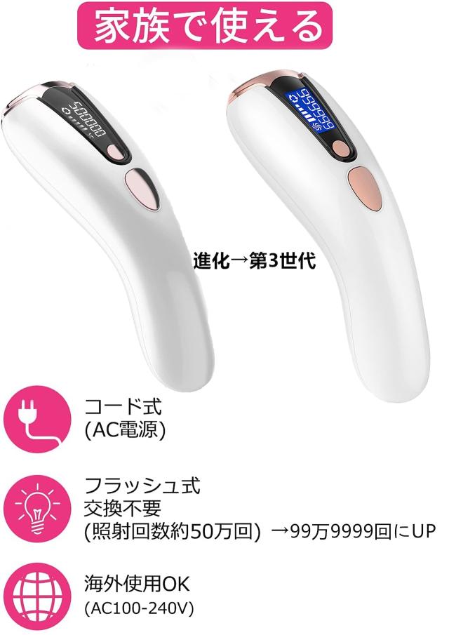 ・実験により、最短4週間使用で効果を実感できます。サファイアガラスを採用し、お肌への刺激や負担や不快感を抑え、自宅でも脱毛サロンように快適な体験を与えます