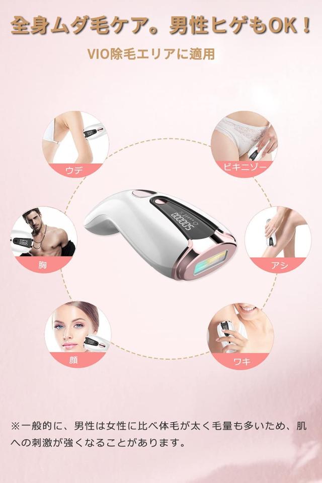 ・腕や脚、ワキ、ボディー、顔、VIOなどデリケートな部位を含めてほぼ全身に使える家庭用脱毛器です。