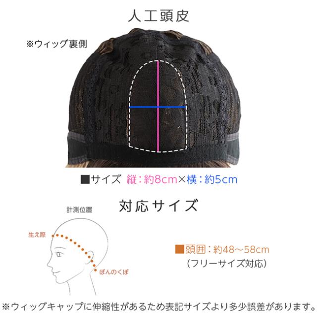 | サイズ | フリーサイズ(頭のサイズ約48cmから58cm) アジャスターでサイズ調整可能 ※ウィッグに伸縮性がある為、表記サイズより多少誤差があります。 |