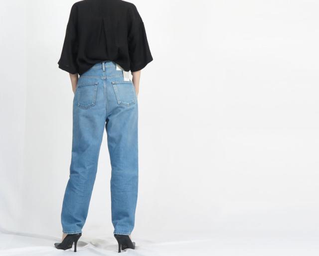 全体的に少し緩めのボディーで、しっかりハイウエストで穿くのも良し、少し落としてゆるさを出すとボーイズライクなシルエットが際立ちます。