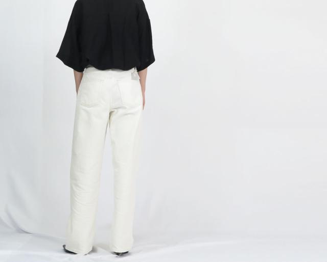 ハイウエストの設定でヒップとわたりに程よくゆとりをもたせた自然な丸みのあるシルエットです。裾に向かってゆるやかにテーパードし、きれいなシルエットを形成したストレートモデルのジーンズです。