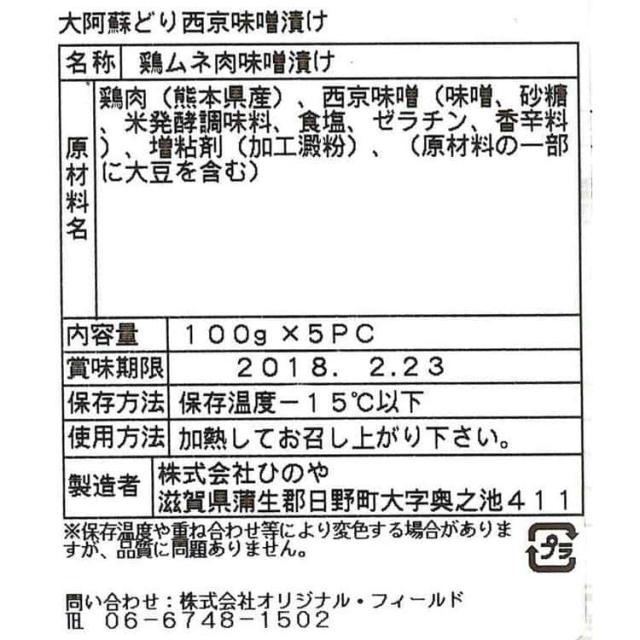 鶏肉(熊本県産)、西京味噌(味噌、砂糖 、米発酵調味料、食塩、ゼラチン、香辛料)、増粘剤(加工澱粉)、(原材料の一部に大豆を含む)