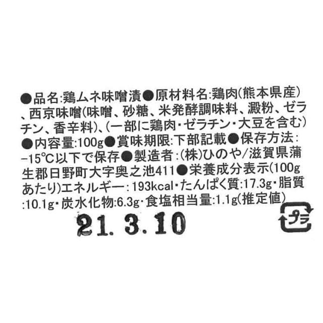 鶏肉(熊本県産)、西京味噌(味噌、砂糖 、米発酵調味料、澱粉、ゼラチン、香辛料)、(一部に鶏肉・ゼラチン・大豆を含む)