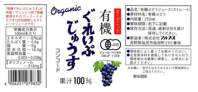 米国ワシントン州政府認定の有機ぶどうが原料の有機ジュース