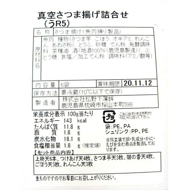 鹿児島 「松野下蒲鉾」 真空さつま揚げ詰合せ 上棒天6本 つけあげ天4枚 さつま芋天3枚 ごぼう天3枚 れんこん天3枚 磯の香天4枚 お歳暮 お中元 お土産 ご進物 ギフト 6850001