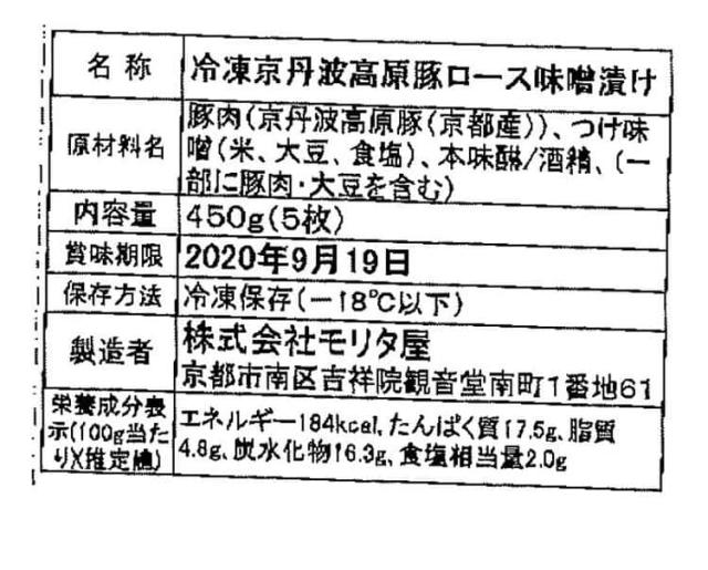 ●豚肉(京丹波高原豚(京都産))、つけ味噌(米、大豆、食塩)、本味醂/酒精、(一部に豚肉・大豆を含む)
