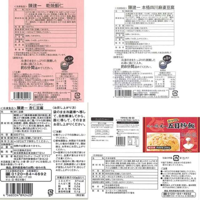 ●乾焼蝦仁(エビチリソース):えび(タイ産)、トマトケチャップ、野菜(トマト、ねぎ、しょうが、にんにく)、大豆油、卵、砂糖、でんぷん、豆板醤、小麦粉、酒、チューニャン(もち米、酒、米こうじ、砂糖)、ポーク・チキンエキス、食塩、醸造酢、香辛料、しょう油、脱脂粉乳、揚げ油(大豆油)/増粘剤(加工デンプン、増粘多糖類)、調味料(アミノ酸等)、ベーキングパウダー、酸味料、(一部に小麦・卵・乳成分・えび・大豆・豚肉・鶏肉を含む)