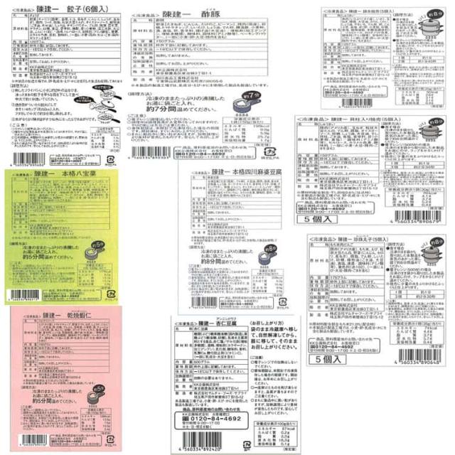 ●乾焼蝦仁(エビチリソース):えび(タイ産)、トマトケチャップ、野菜(トマト、ねぎ、しょうが、にんにく)、大豆油、卵、砂糖、でんぷん、豆板醤、小麦粉、酒、チューニャン(もち米、酒、米こうじ、砂糖)、ポーク・チキンエキス、食塩、醸造酢、香辛料、しょう油、脱脂粉乳、揚げ油(大豆油)/増粘剤(加工デンプン、増粘多糖類)、調味料(アミノ酸等)、ベーキングパウダー、酸味料、(一部に小麦・卵・乳成分・えび・大豆・豚肉・鶏肉を含む)