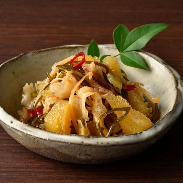 北海道の郷土料理である「松前漬け」は「するめ」と「昆布」の旨味が程よく引き出され温かいご飯にのせたり、酒の肴としても美味しくお召し上がりいただけます。