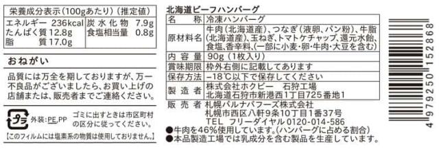牛肉(北海道産)、つなぎ(液卵、パン粉)、牛脂(北海道産)、玉ねぎ、トマトケチャップ、還元水飴、食塩、香辛料、(一部に小麦・卵・牛肉・大豆を含む)