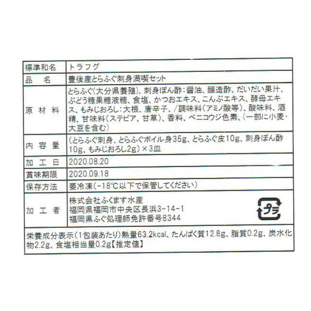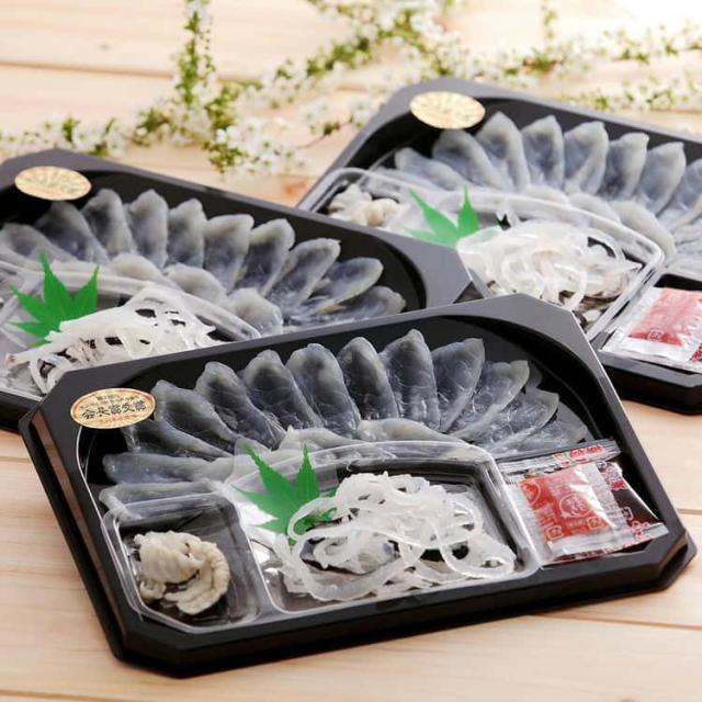 ■規格:(とらふぐ刺身・とらふぐボイル身35g、とらふぐ皮10g、ぽん酢10g、もみじおろし2g)×3皿