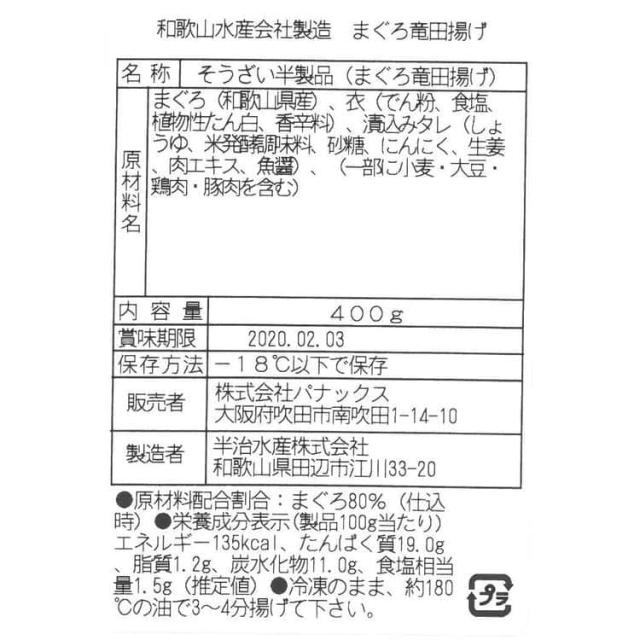 ●まぐろ(和歌山県産)、衣(でん粉、食塩、植物性たん白、香辛料)、漬込みタレ(しょうゆ、米発酵調味料、 砂糖、にんにく、生姜、肉エキス、魚醤)、(一部に小麦・大豆・鶏肉・豚肉を含む)