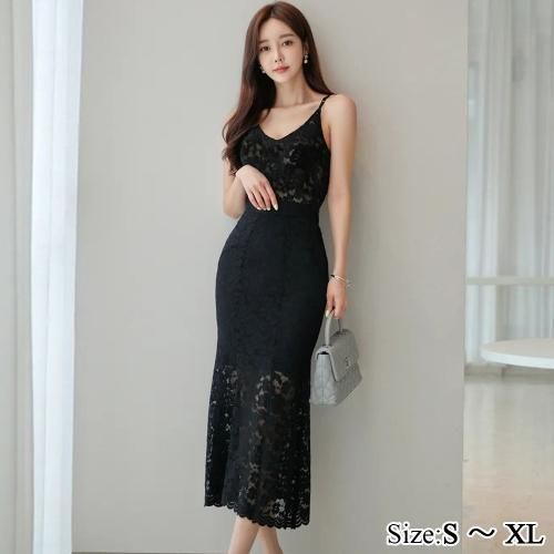 【グラシア】 キャバ ドレス キャバドレス ワンピース ミディアムドレス キャミワンピ エレガント キャミ ストレスフリー ロング 伸縮性 総レース レース ブラック S M L XL