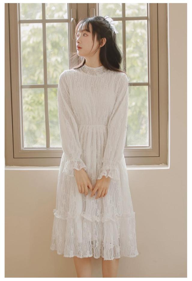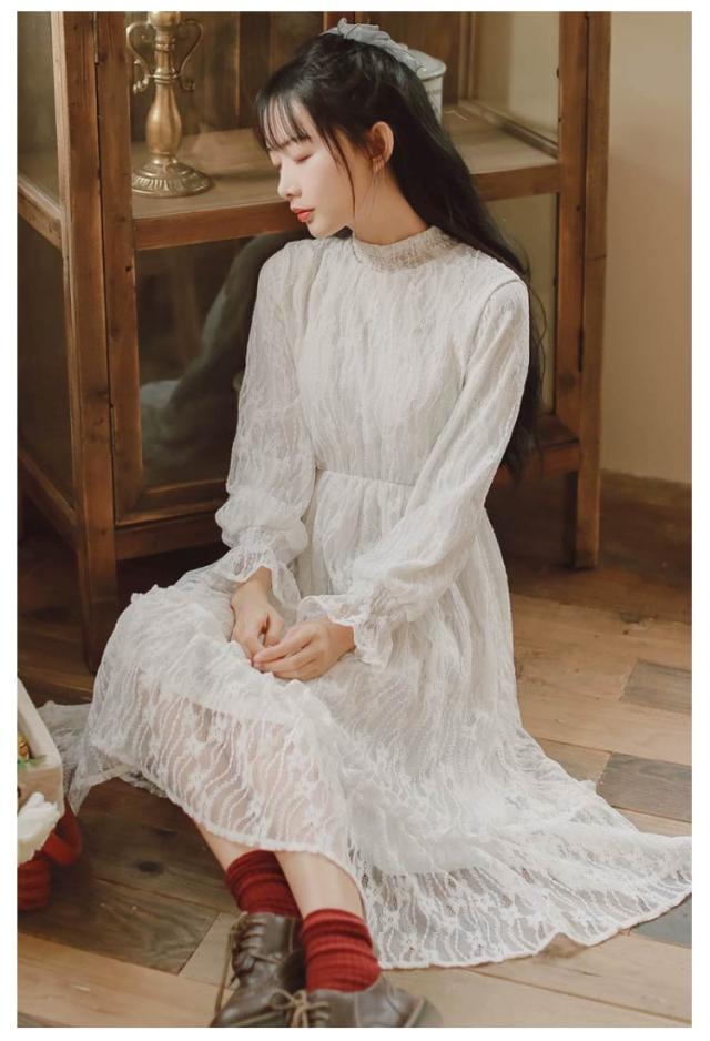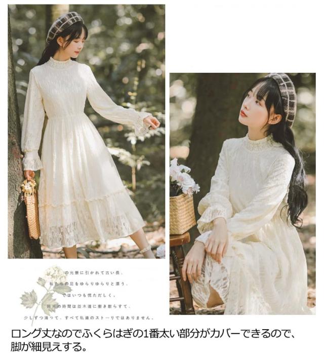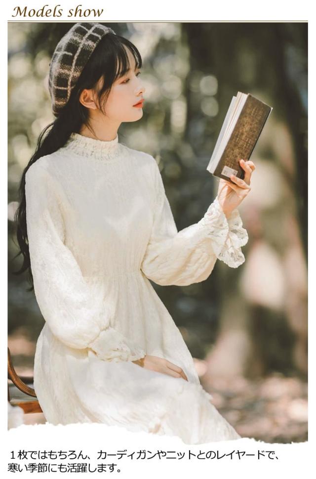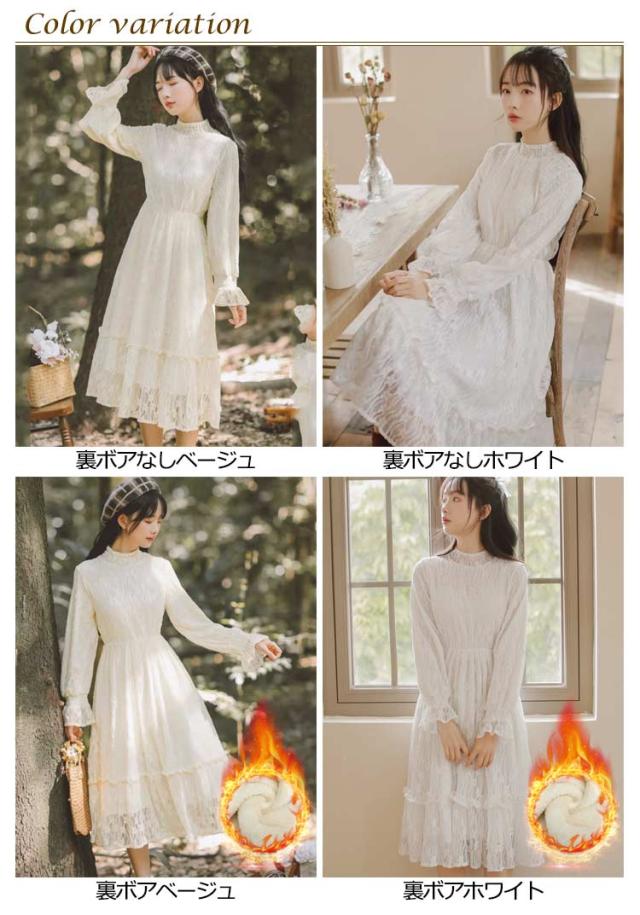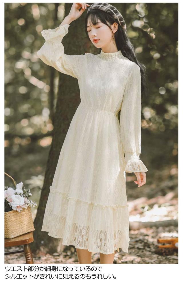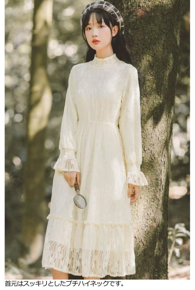 ロングワンピース 長袖 総レース シャーリング 秋 ワンピース 総レース ハイネック 可愛い ロング丈 レースワンピース 裏起毛 パーティー フェミニン おしゃれ フリル オフィス 通勤 レディース ドレス フォーマル 20代 30代 40代 結婚式 送料無料