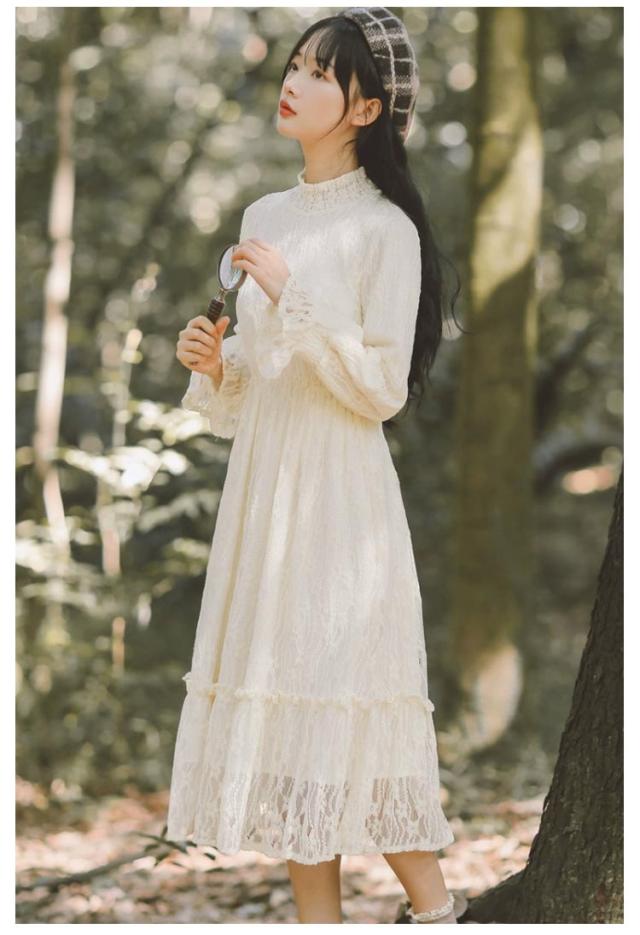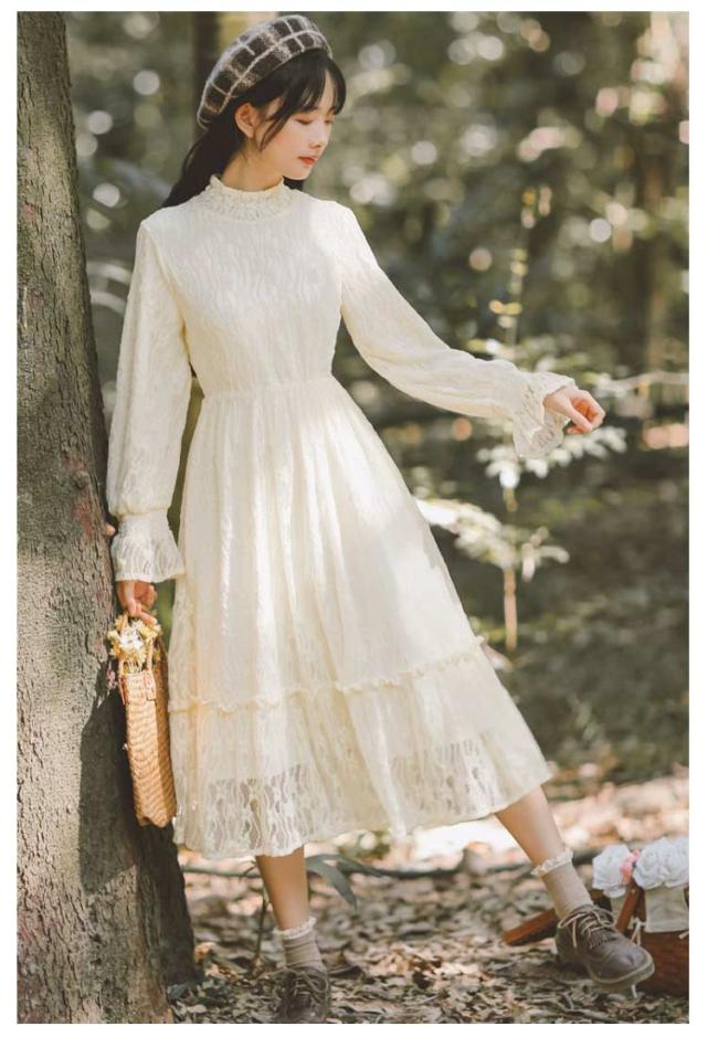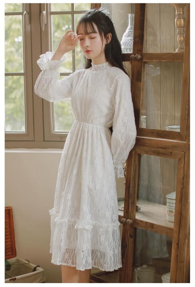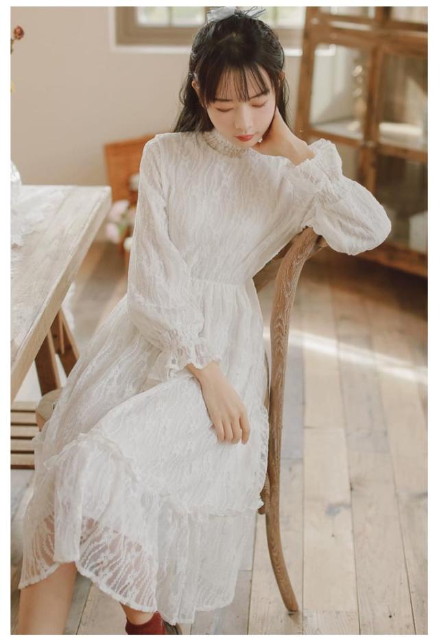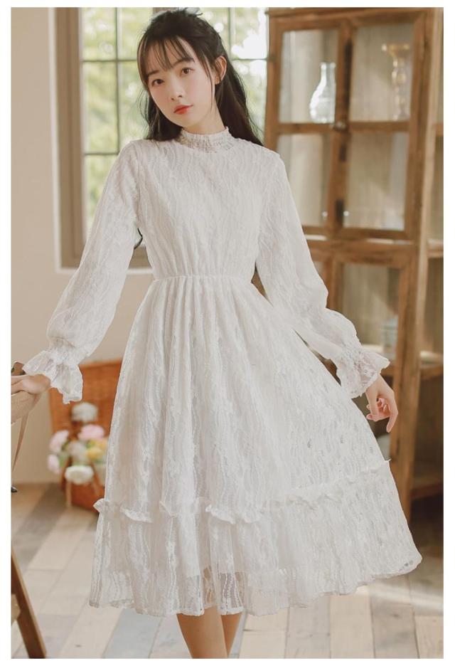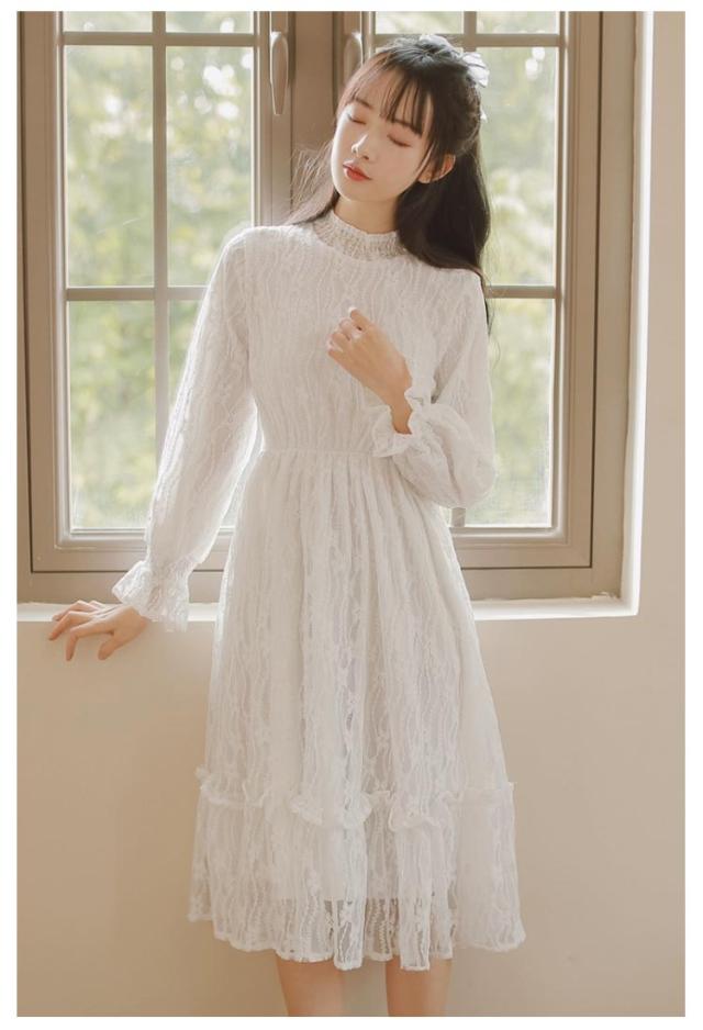 ロングワンピース 長袖 総レース シャーリング 秋 ワンピース 総レース ハイネック 可愛い ロング丈 レースワンピース 裏起毛 パーティー フェミニン おしゃれ フリル オフィス 通勤 レディース ドレス フォーマル 20代 30代 40代 結婚式 送料無料
