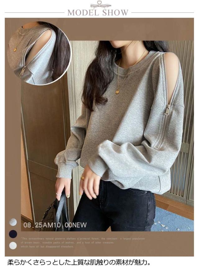 パーカー トレーナー 肩露出 個性的 トレンド トレンド感たっぷり!袖ファスナー プルオーバーパーカー 肩だし 肩出し スウエット セクシー トップス 春 春服 レディース ラウンドネック 秋 秋服 送料無料