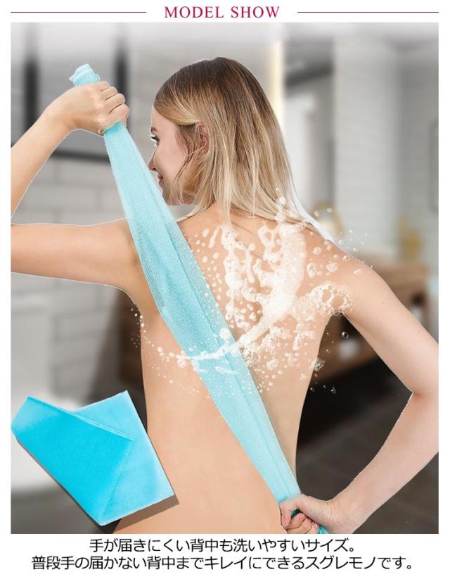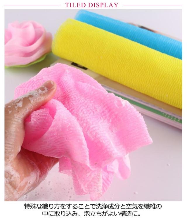 | ふわふわソフト!お肌に優しいボディタオル。 インテリアにも馴染みやすい、飽きのこない8カラー展開。 手が届きにくい背中も洗いやすいサイズ。普段手の届かない背中までキレイにできるスグレモノです。 タオルにお湯を含ませて、ボディソープや石鹸などを付け、手足の先から身体の中心に向かって軽くマッサージをするように! 特殊な織り方をすることで洗浄成分と空気を繊維の中に取り込み、泡立ちがよい構造に。 心地よい刺激をもたらし、お肌をやさしく“つるつる”に磨き上げます。余分な皮脂・角質をすっきり落とし、ツルツルスベスベに整えてくれます。 | |