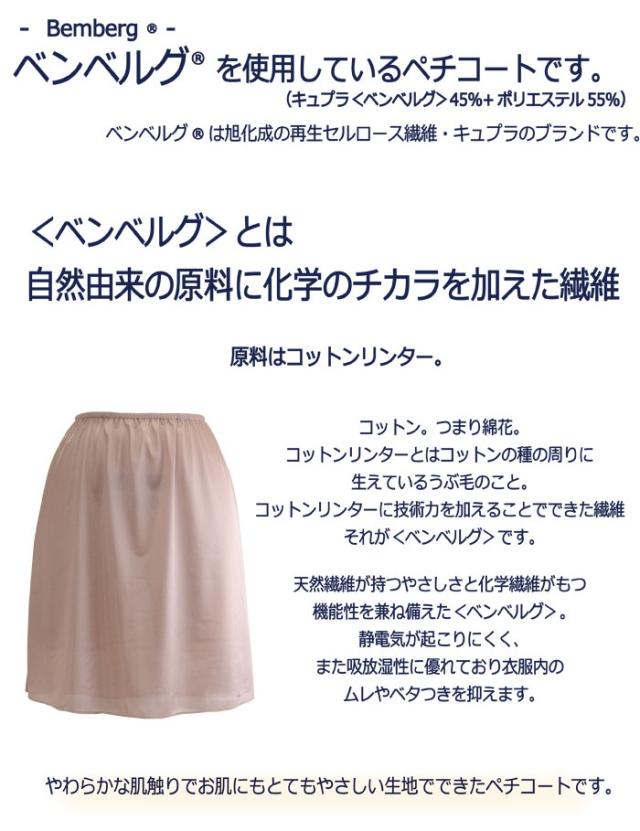 天然繊維が持つやさしさと化学繊維がもつ機能性、両方のよいところを兼ね備えた旭化成の<ベンベルグ>ペチコートをぜひお試し下さい。