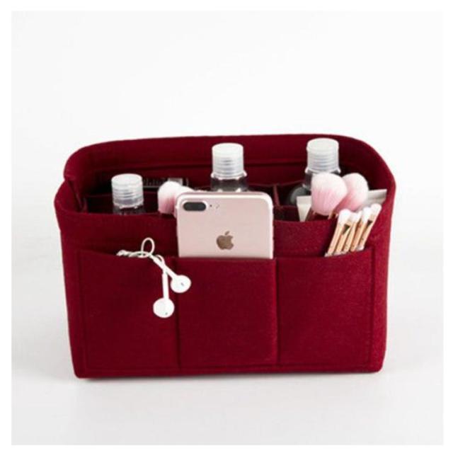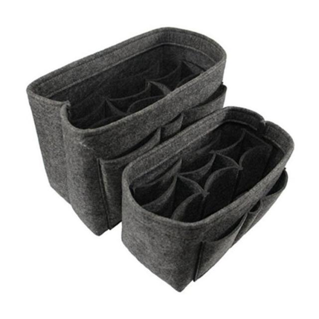 | 大人気話題のバッグインバッグ! ごちゃごちゃしがちなバッグの中身をスッキリまとめちゃうことができます。 中央の仕切りはマジックテープで着脱が可能! お好きなスペースでお使いいただけます。 厚手のフェルト生地で丈夫なつくりとなっています。 小物入れとしてもつかえる、シンプルなデザインとなっています。 | |