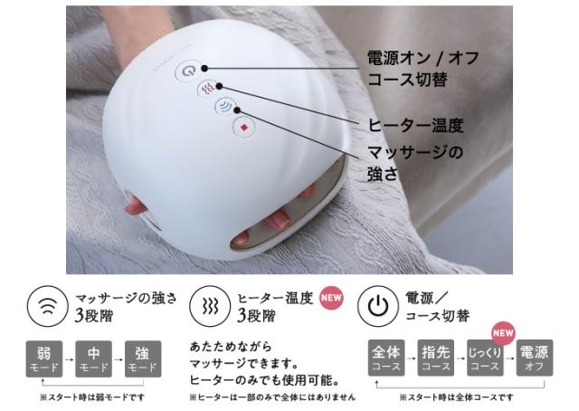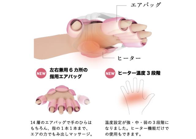左右兼用6カ所の指用エアバッグ・・・14層のエアバッグで手のひらはもちろん、指の1本1本まで、エアの力でもみ出しマッサージ。ヒーター温度3段階・・・温度設定が強・中・弱の3段階になりました。ヒーター機能だけでの使用もできます。