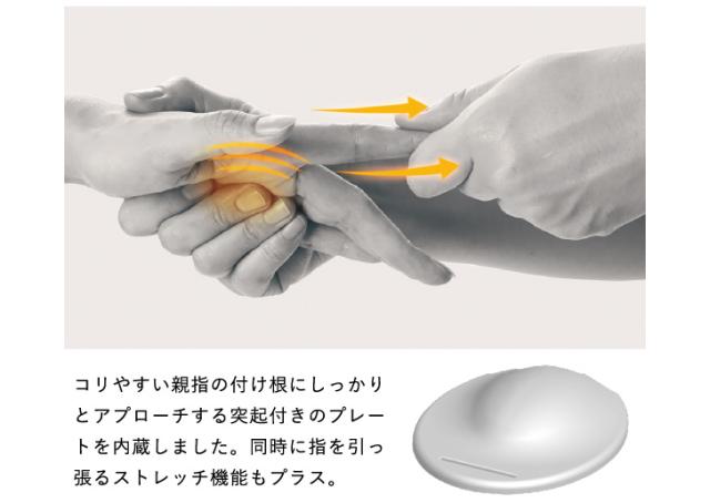 コリやすい親指の付け根にしっかりとアプローチする突起付きのプレートを内蔵しました。同時に指を引っ張るストレッチ機能もプラス。3つのプログラムコース