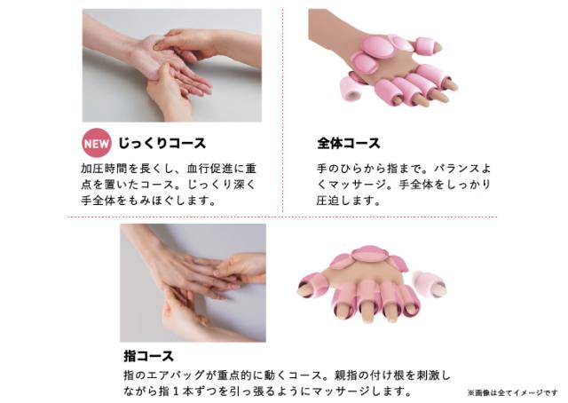 指コース・・・指のエアバッグが重点的に動くコース。親指の付け根を刺激しながら指1本ずつを引っ張るようにマッサージします。