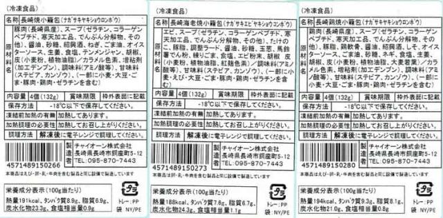 ●長崎鶏焼小籠包:鶏肉(長崎県産)、スープ(ゼラチン、コラーゲン ペプチド、寒天加工品、でんぷん分解物、その他)、豚脂、鶏軟骨、醤油、紹興酒、しそ、オイスターソース、ごま油、砂糖、ネギ、食塩、生姜、 胡椒、皮(小麦粉、植物油脂、大麦若葉)/カラメル色素、増粘剤(加工デンプン)、調味料(アミノ酸等)、甘味料(ステビア、カンゾウ)、(一部に小麦・大豆・ごま・豚肉・鶏肉・ゼラチンを含む)